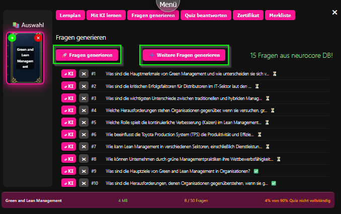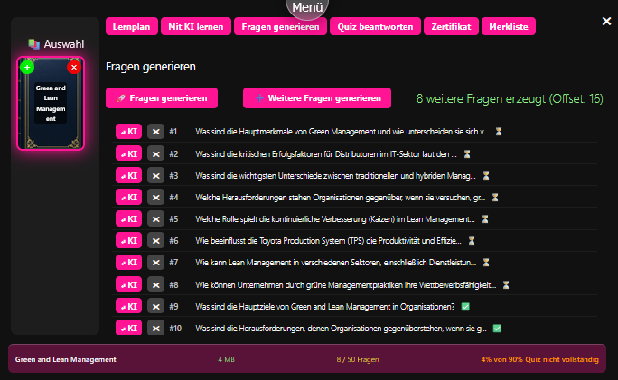 Der nächste Schritt kann nun sein mit der KI zu lernen oder das Quiz zu beantworten, wenn man die ersten Antworten schon gesammelt hat.