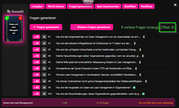 Möchte man die erforderliche Anzahl an Fragen generieren, reicht es dementsprechend oft den Button Weitere Fragen generieren zu klicken.