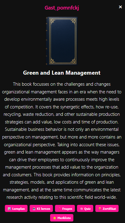 Dieses Panel dient dazu, Lernmodule strukturiert zusammenzustellen und zu verwalten. Über eine zentrale Auswahloberfläche können einzelne Bausteine ausgewählt, organisiert und in den Lernablauf integriert werden. Navigations- und KPI-Elemente helfen dabei, Fortschritte zu überwachen und den Workflow Schritt für Schritt zu steuern. Durch klicken auf die Auswahl, wird der Wissensbestand geladen, erscheint ein Rahmen in rosa, ist der Wissensbestand aktiv.