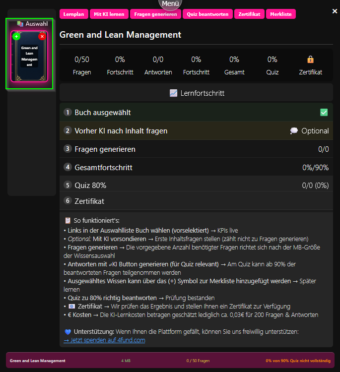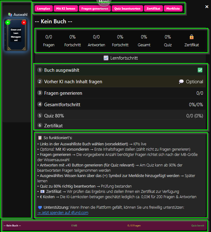 In diesem Panel wird auf Basis der getroffenen Auswahl automatisch ein individueller Lernplan generiert. Der Fortschritt wird kontinuierlich berechnet und in Echtzeit angezeigt. Zudem werden benötigte Fragen und Antworten erfasst, um die Quizbereitschaft gezielt aufzubauen und den Lernprozess effizient zu steuern.