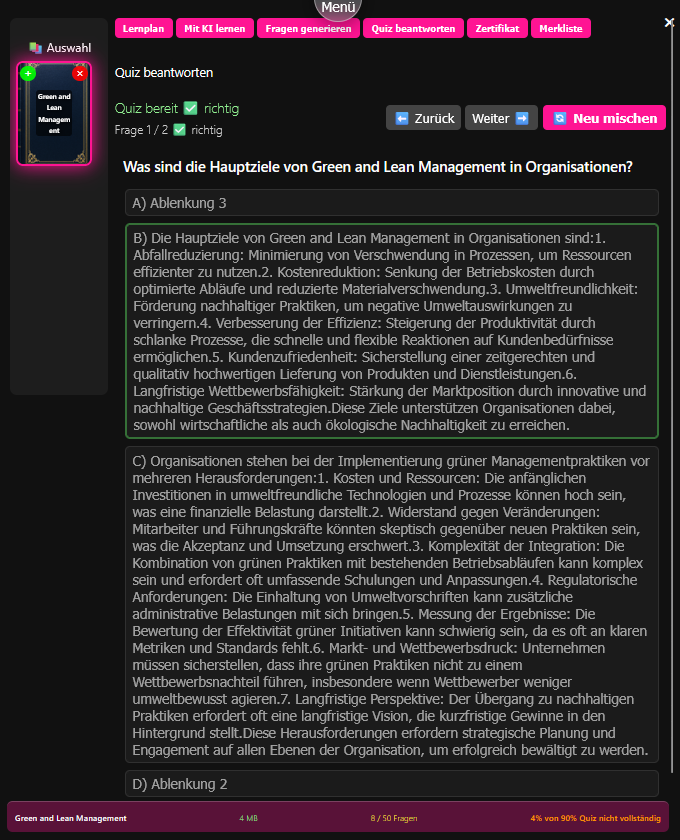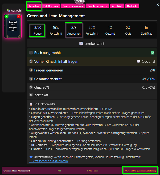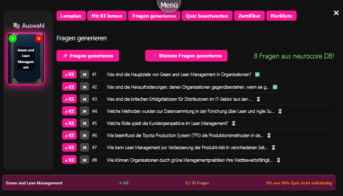 Hat man 90% der erforderlichen Fragenanzahl mit der KI beantwortet, kann das Quiz mit mind. 80% richtig bestanden werden. Bestandene Quiz schalten das Zertifikat frei.