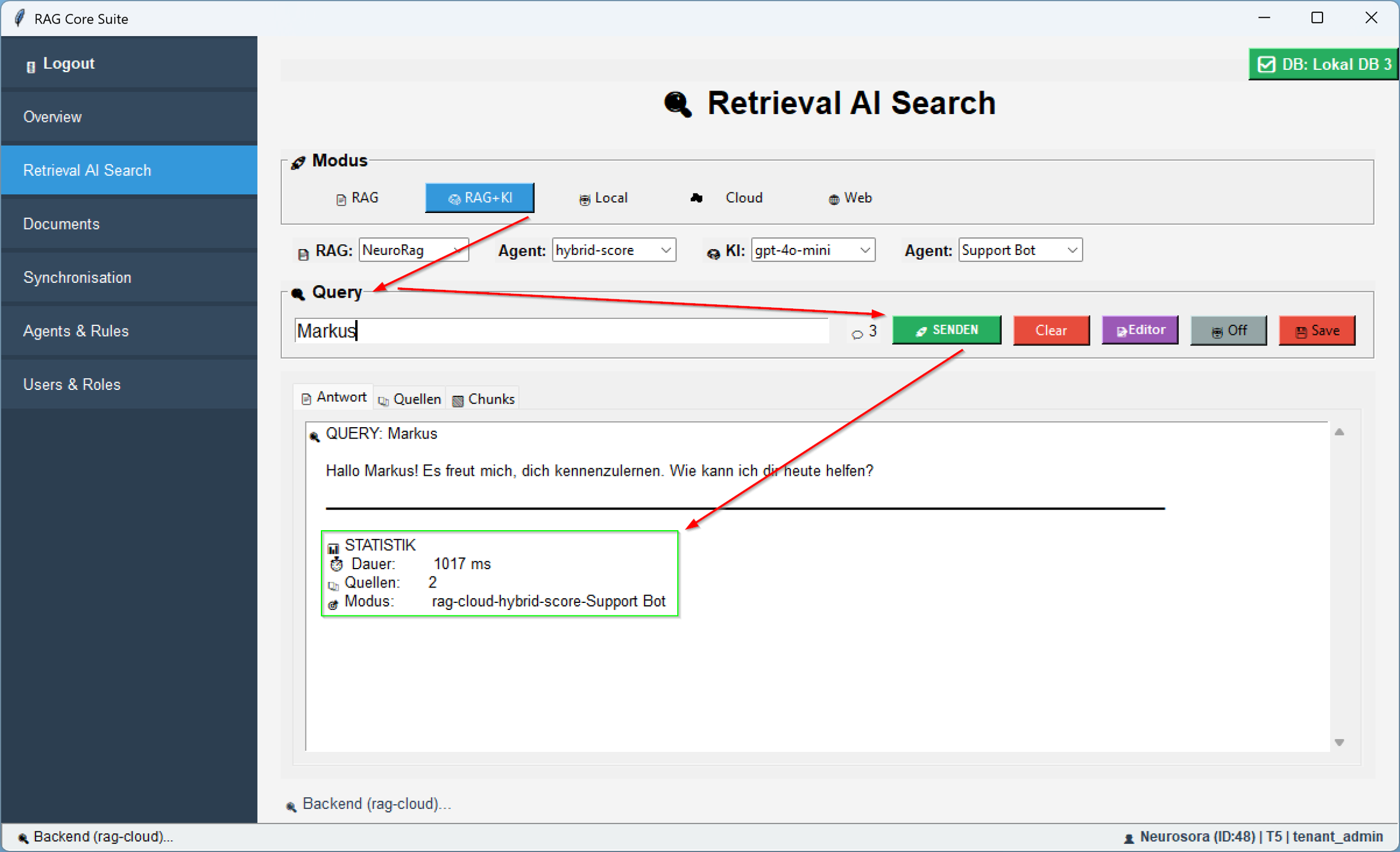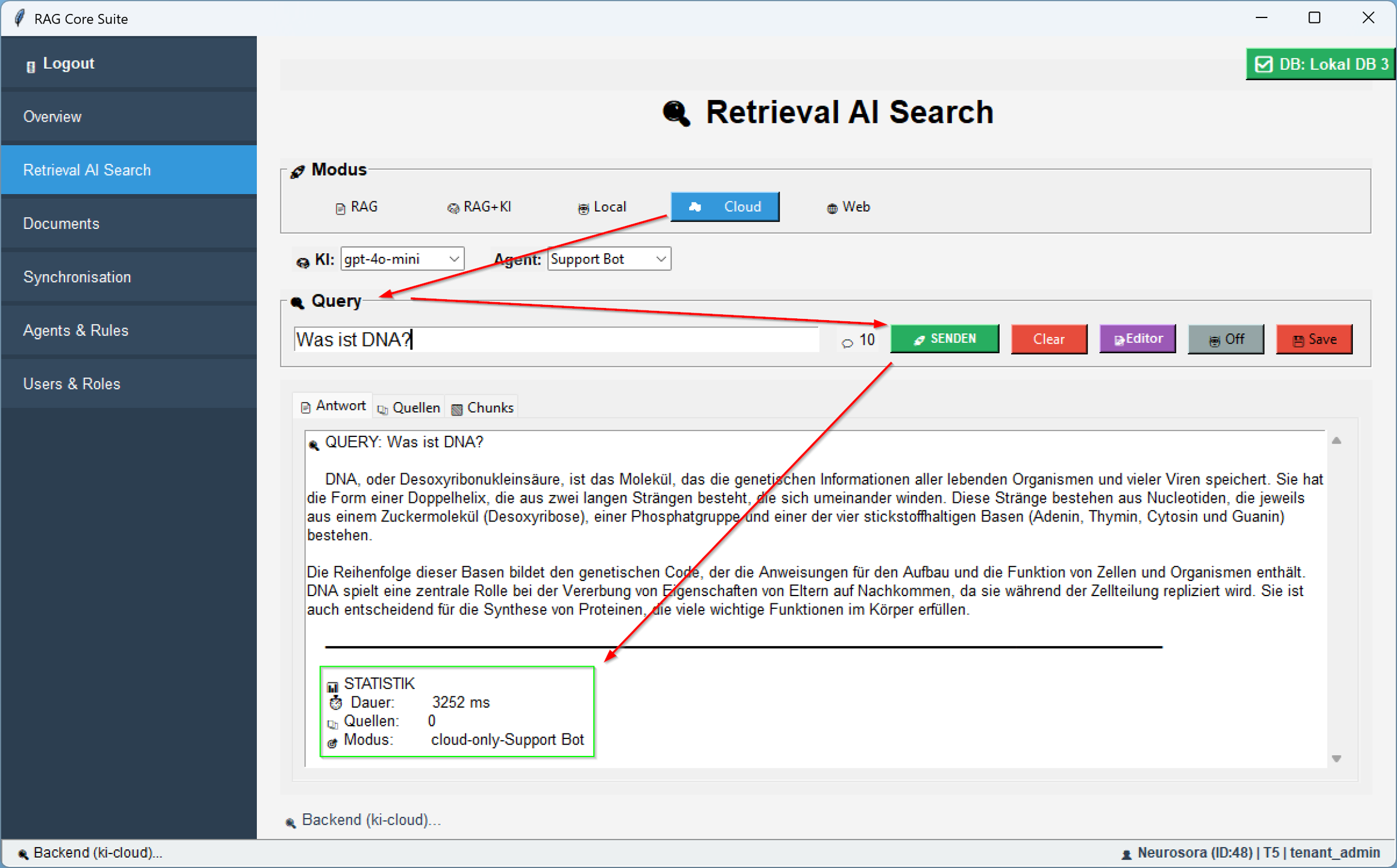 Im reinen CloudâModus wird dein Query direkt an OpenAI gesendet â ohne VorabâRAGâSearch, dafĂŒr mit vollem Zugriff auf die neuesten GPTâModelle.