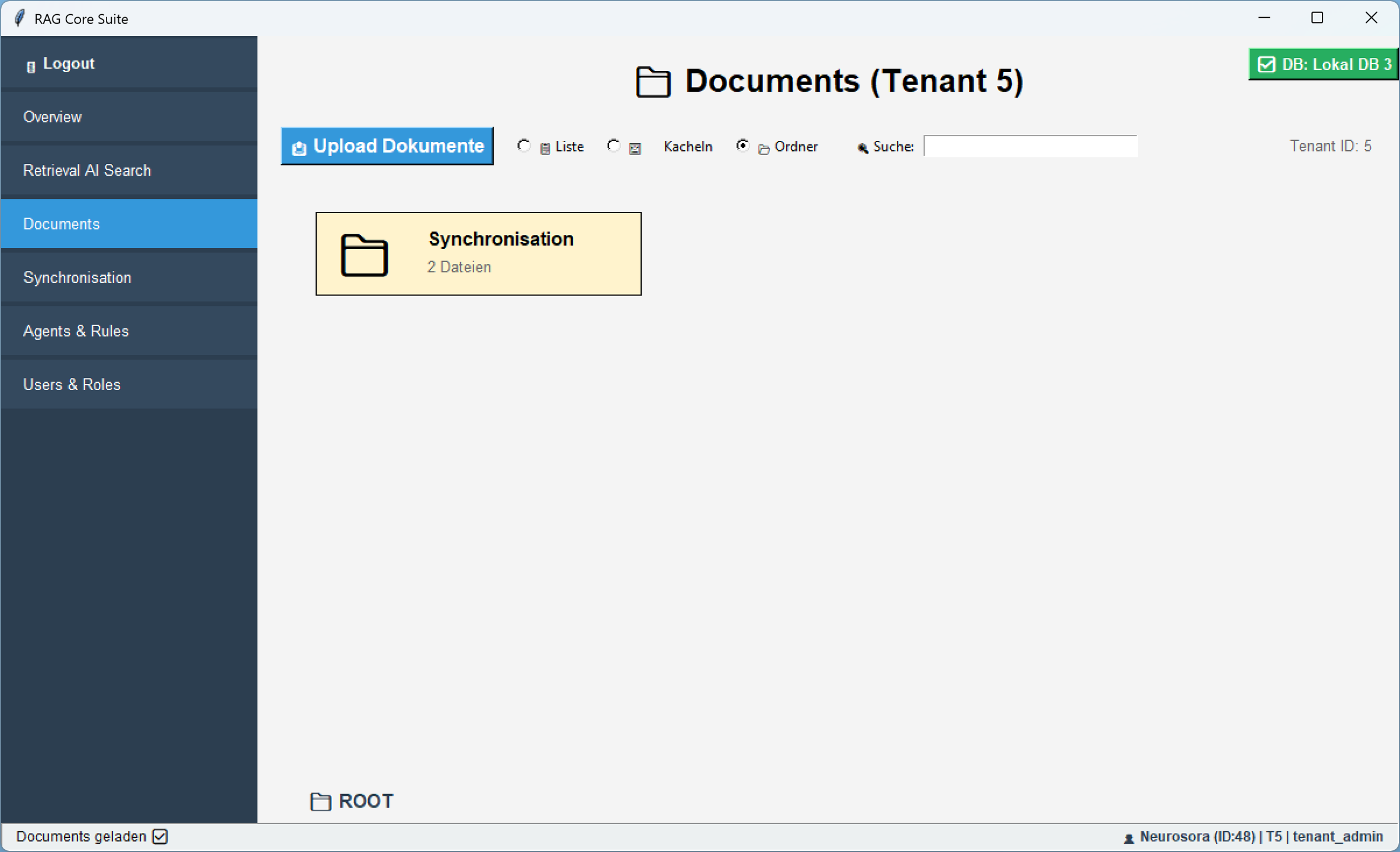 Im Register âDocumentsâ wird deine Dateistruktur als Kacheln mit Rootâ und OrdnerâVisualisierung angezeigt â ĂŒbersichtlich, klickbar und direkt navigierbar.