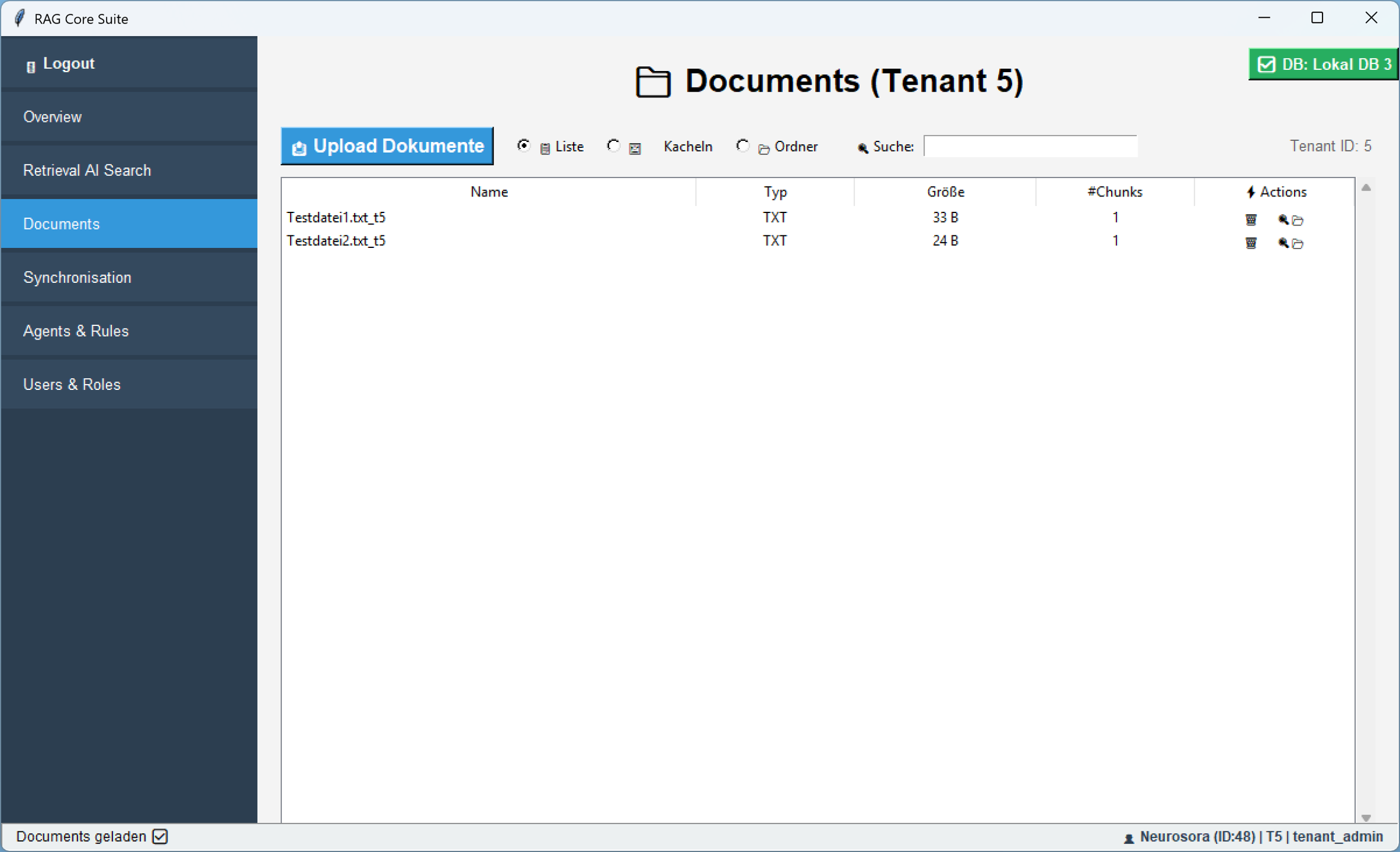 Im Register âDocumentsâ gibt es zusĂ€tzlich eine Listenansicht, in der alle Dateien tabellarisch mit relevanten Metadaten angezeigt werden â ideal fĂŒr schnellen Ăberblick und gezielte Aktionen.