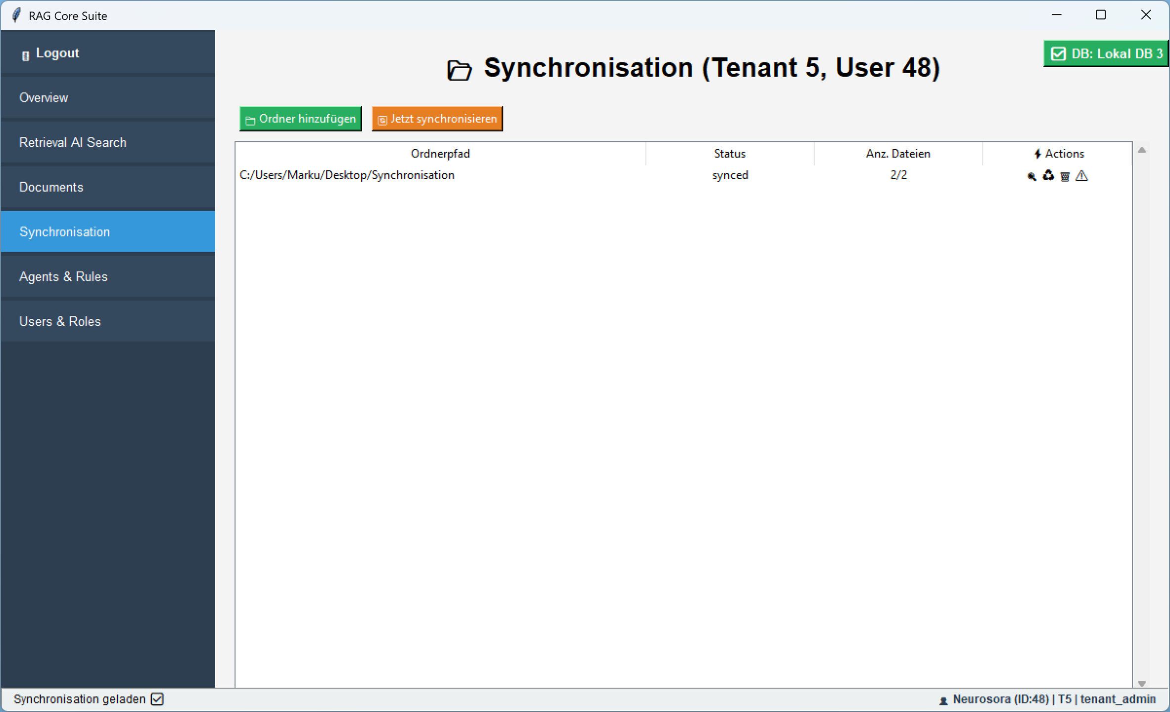 Ăber das Register âSynchronisationâ kannst du lokale Ordnerpfade verwalten, automatisch synchronisieren und deine Datenbank kontinuierlich mit aktuellen Dateien aktualisieren.